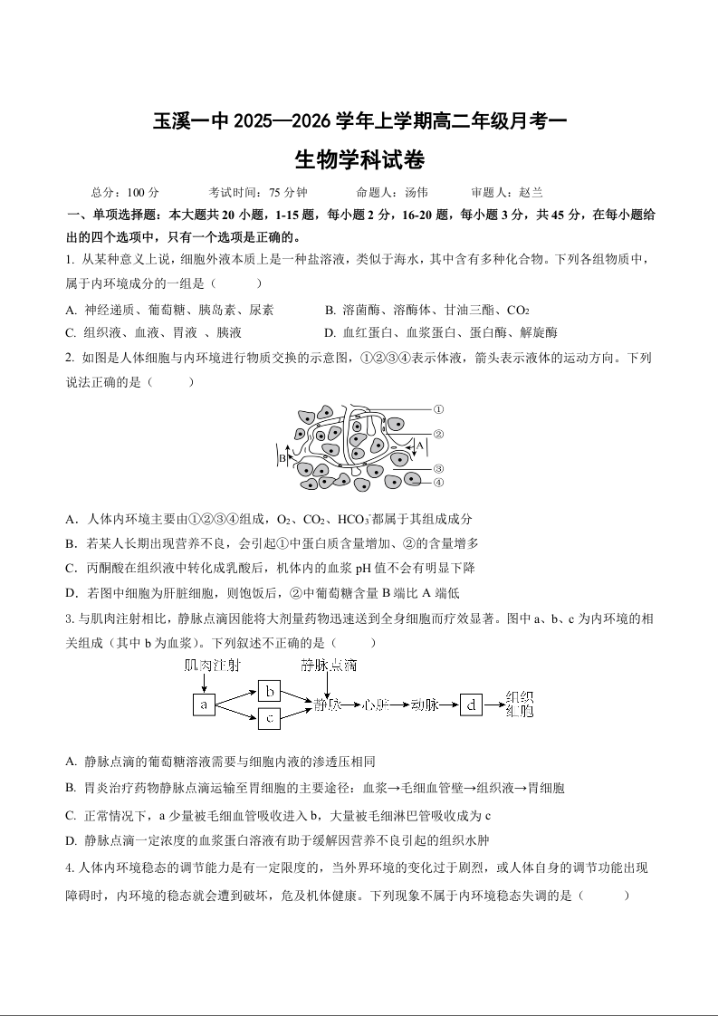 云南省玉溪第一中学2025-2026学年高二上学期第一次月考 生物试卷(含答案).docx
