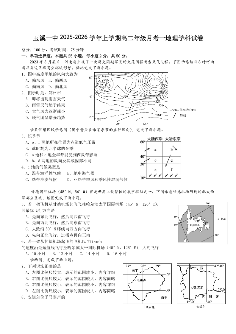 云南省玉溪第一中学2025-2026学年高二上学期第一次月考 地理试卷(含答案).docx