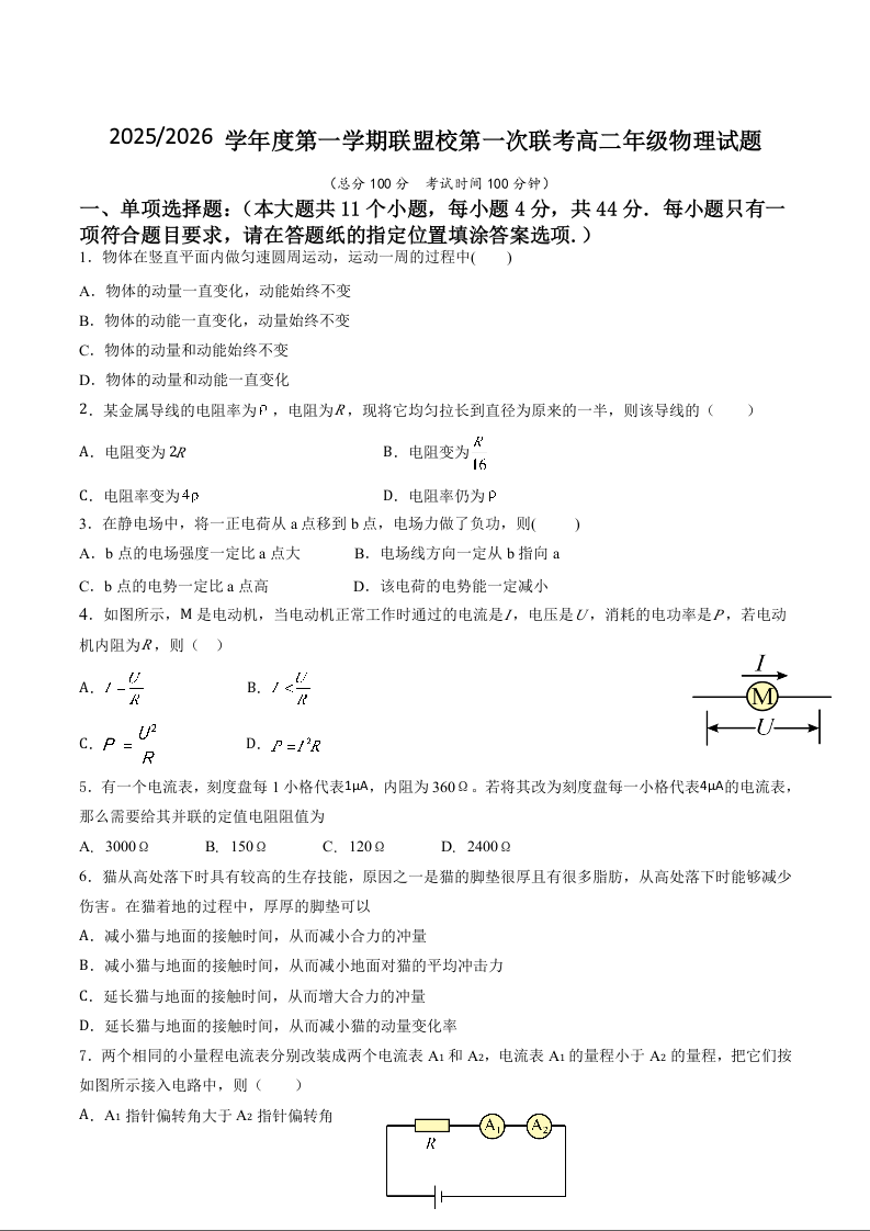 江苏省盐城市五校联考2025-2026学年高二上学期10月第一次联考 物理试题(含答案).docx