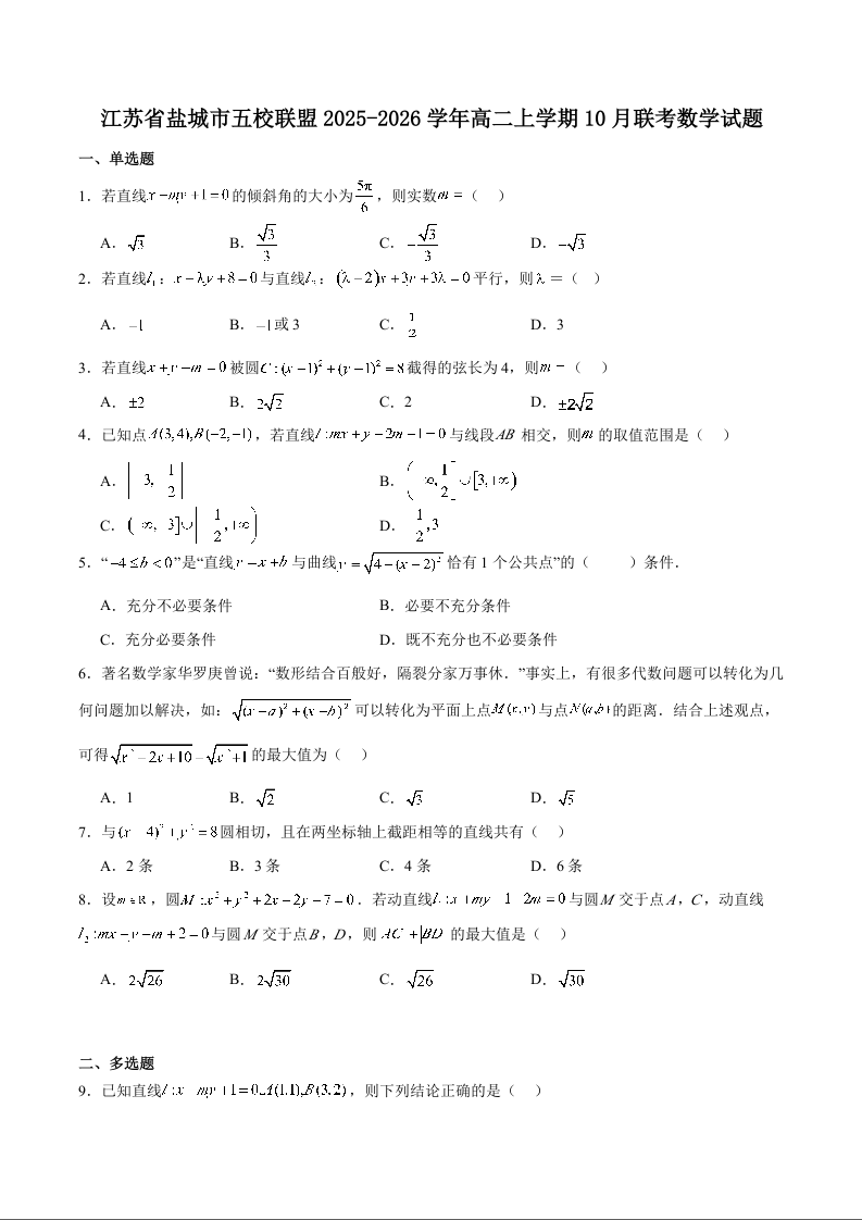江苏省盐城市五校联考2025-2026学年高二上学期10月第一次联考 数学试题(含答案).docx