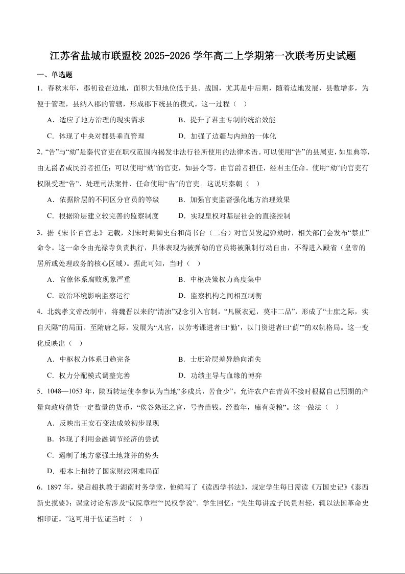 江苏省盐城市五校联考2025-2026学年高二上学期10月第一次联考 历史试题(含答案).docx