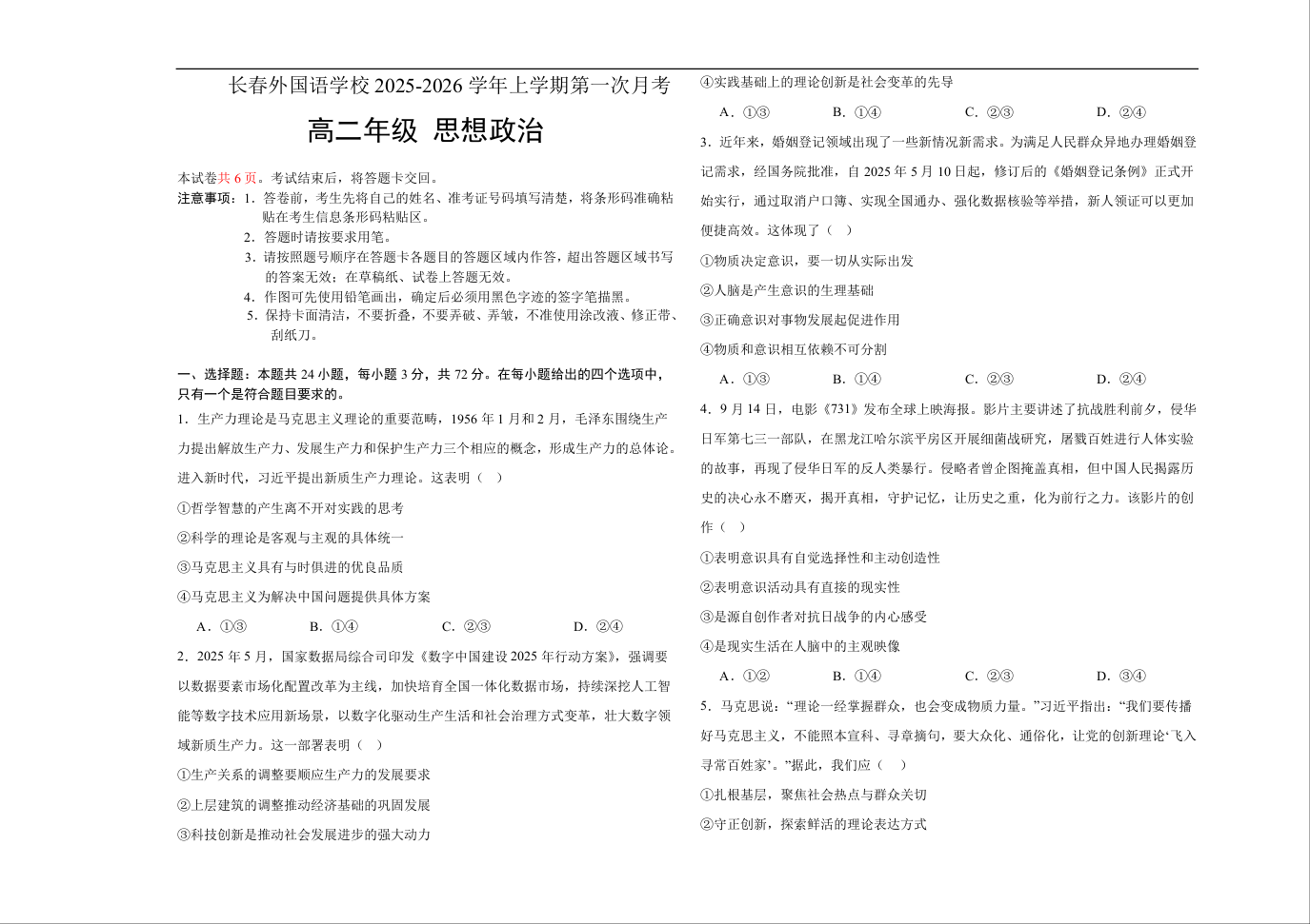 吉林省长春外国语学校2025-2026学年高二上学期10月月考 政治试题(含答案).docx
