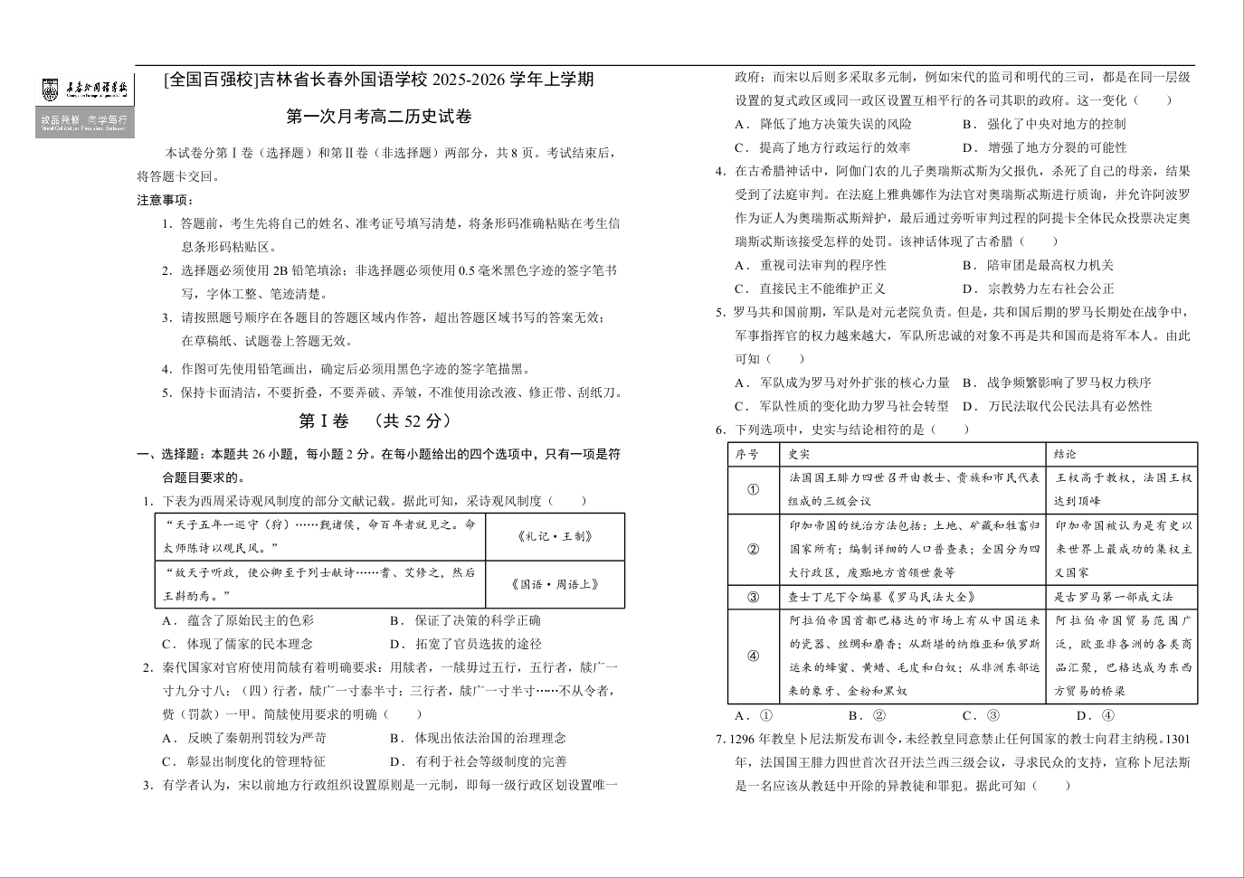 吉林省长春外国语学校2025-2026学年高二上学期10月月考 历史试题(含答案).docx