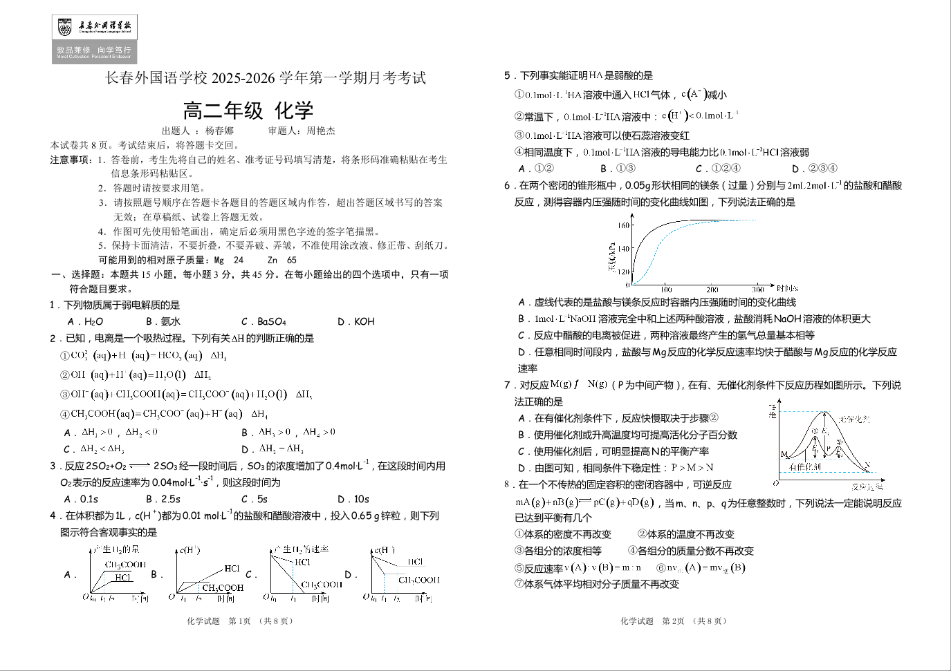 吉林省长春外国语学校2025-2026学年高二上学期10月月考 化学试题(含答案).doc