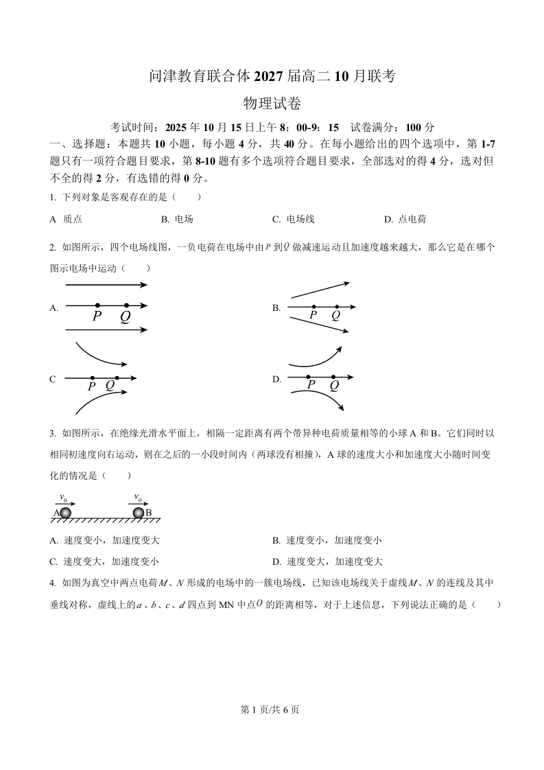 湖北省武汉市问津联盟2025-2026学年高二上学期10月联考 物理.docx