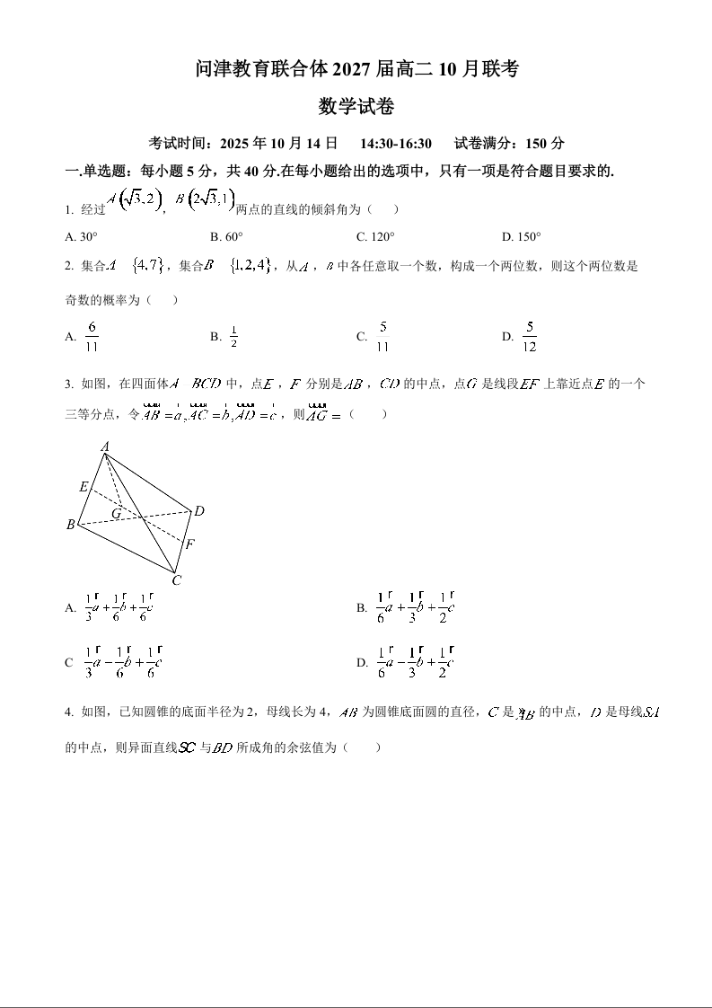 湖北省武汉市问津联盟2025-2026学年高二上学期10月联考 数学.docx