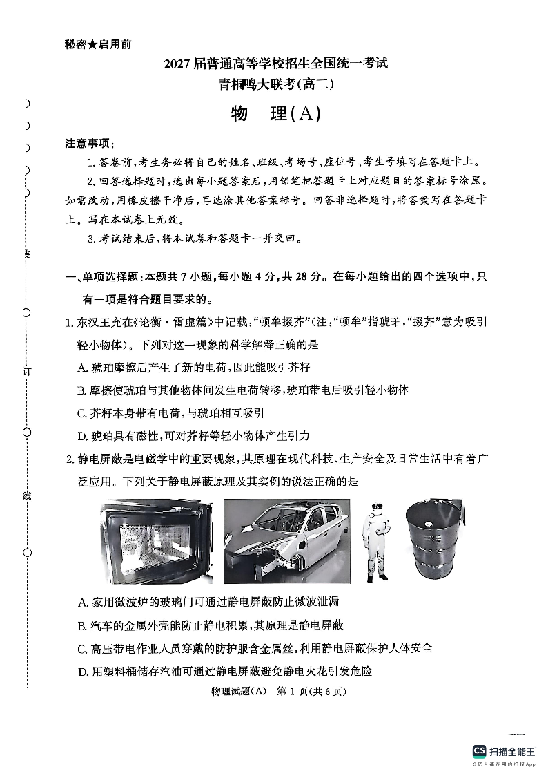物理试卷A-河南高二青桐鸣大联考2025年10月联考.pdf