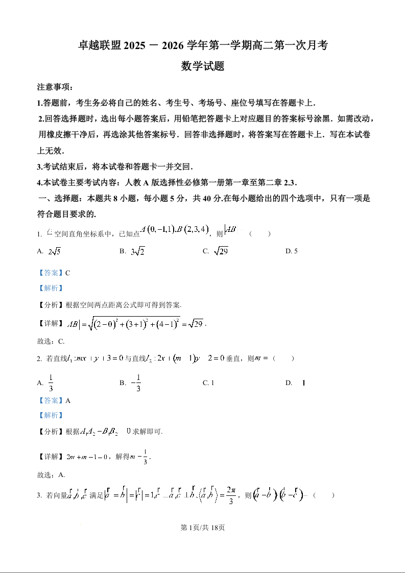河北省邢台市卓越联盟2025-2026学年高二上学期10月月考 数学答案.docx