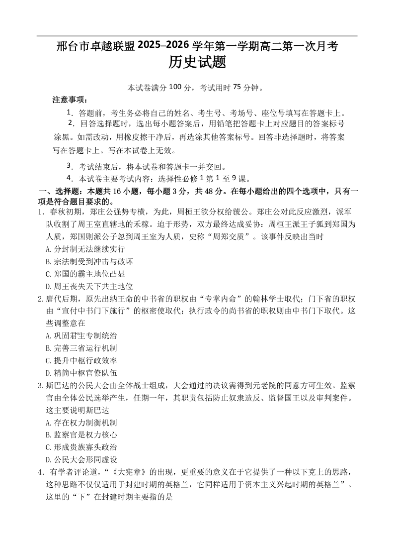 河北省邢台市卓越联盟2025-2026学年高二上学期10月月考 历史.docx