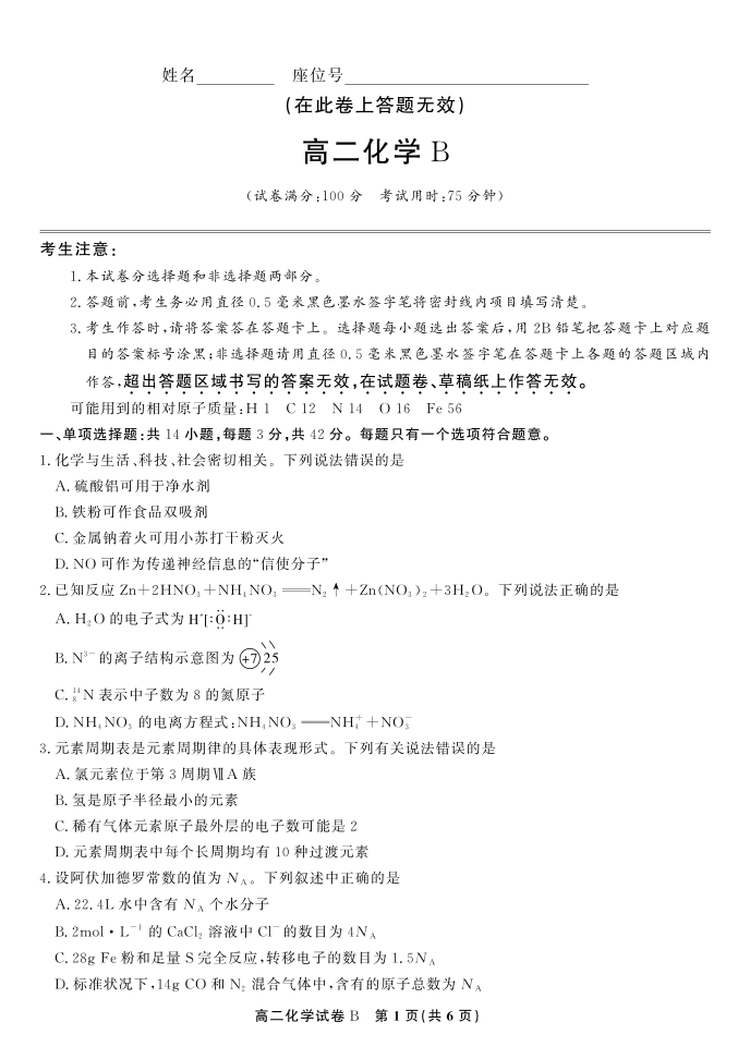 化学试题B·2025年高二10月联考.pdf