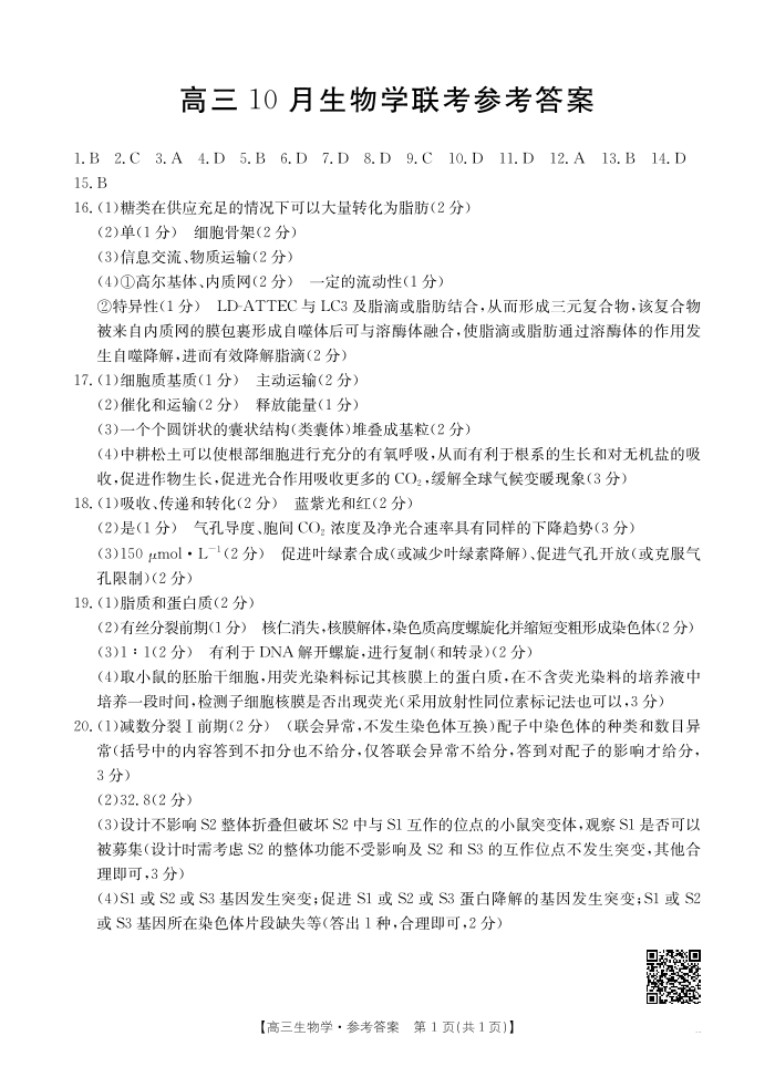 福建省2026届高三上学期10月联考 生物答案.pdf