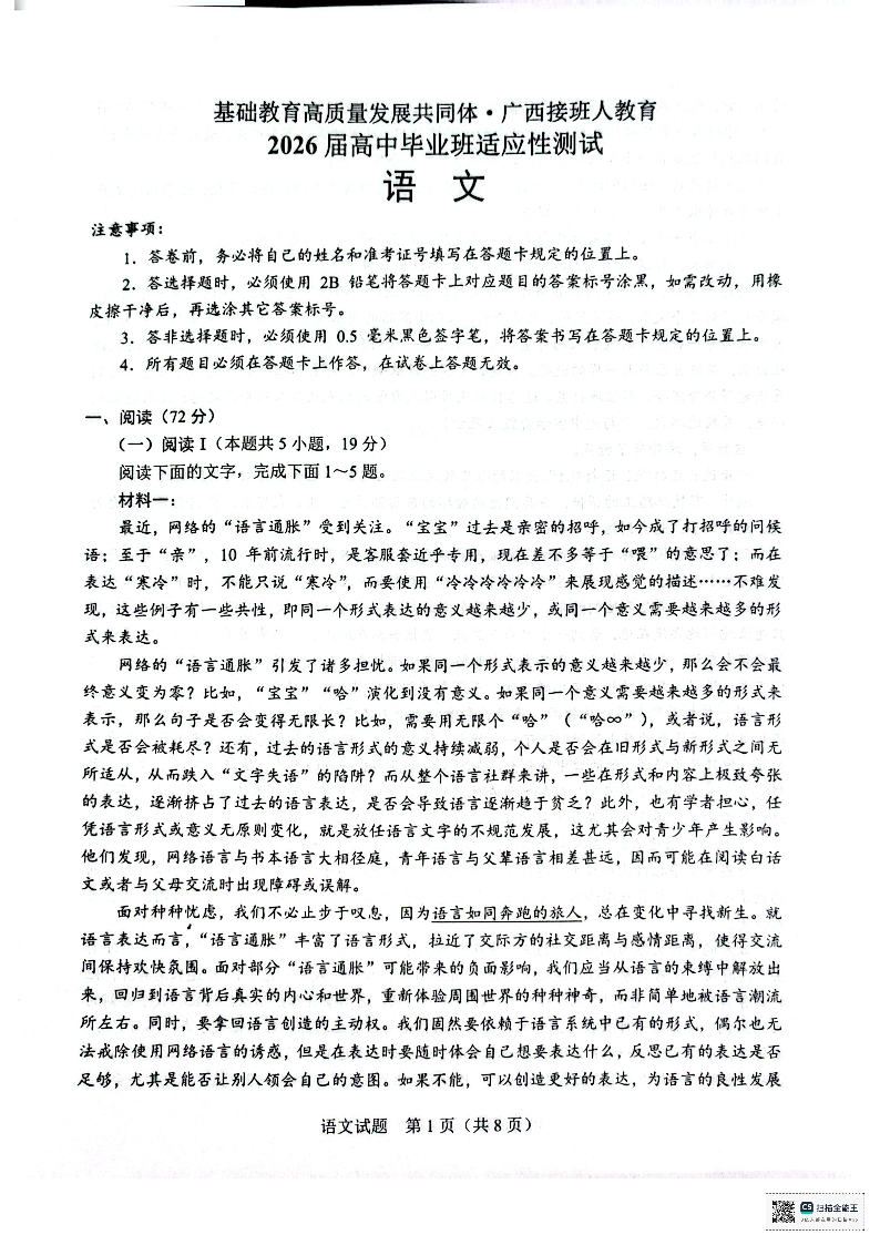 广西接班人教育2026届高中毕业班适应性测试 语文.pdf