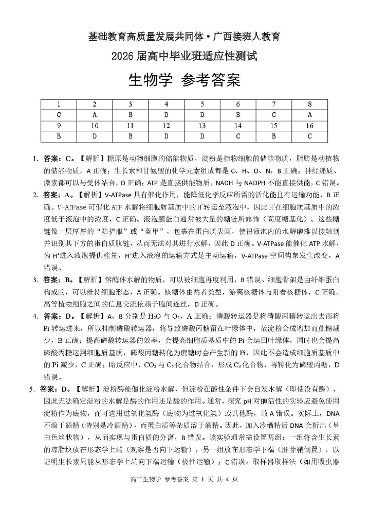 广西接班人教育2026届高中毕业班适应性测试 生物答案.pdf