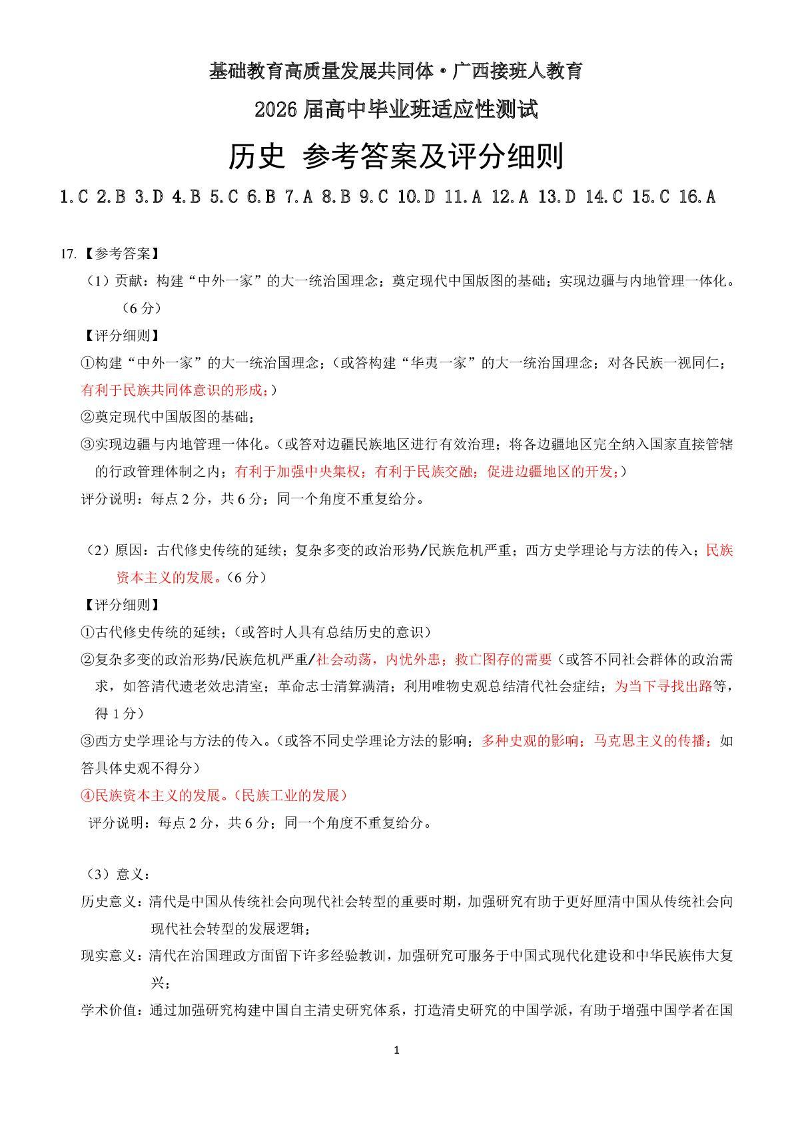 广西接班人教育2026届高中毕业班适应性测试 历史答案.pdf