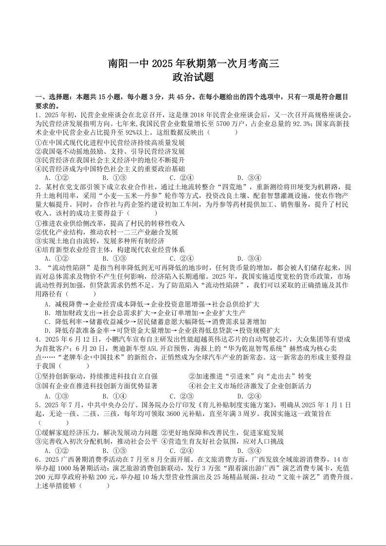 河南省南阳市第一中学2026届高三上学期第一次月考 政治试题(含答案).docx