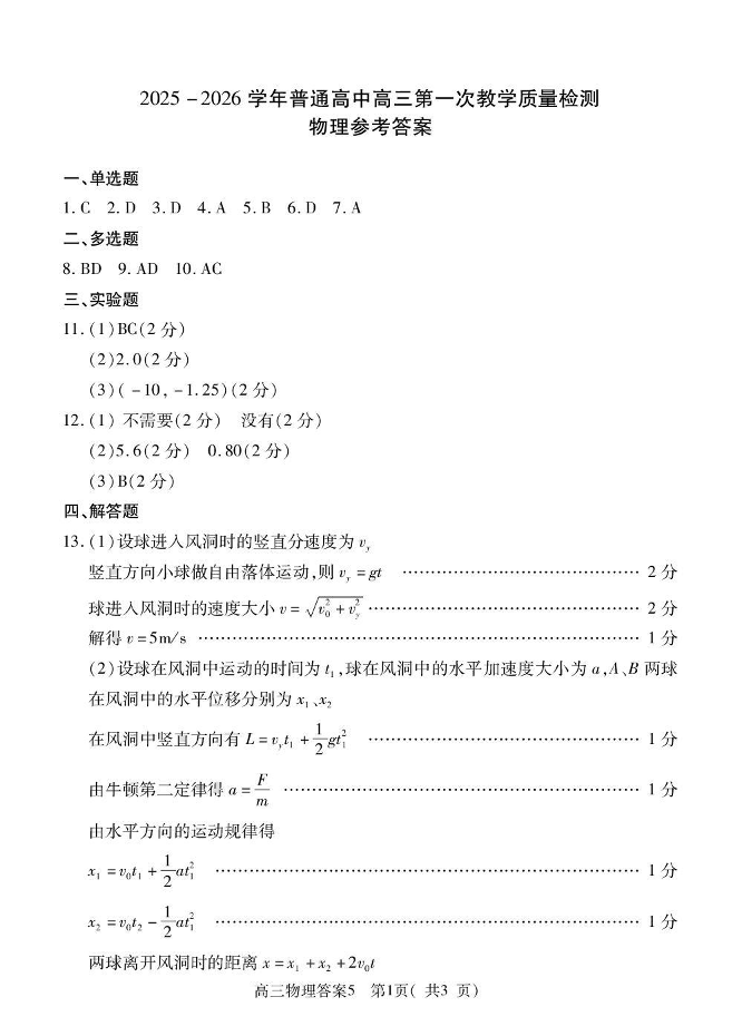 2025-2026学年普通高中高三第一次教学质量检测 物理答案.pdf