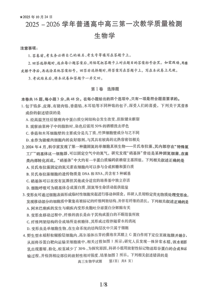 2025-2026学年普通高中高三第一次教学质量检测 生物.pdf
