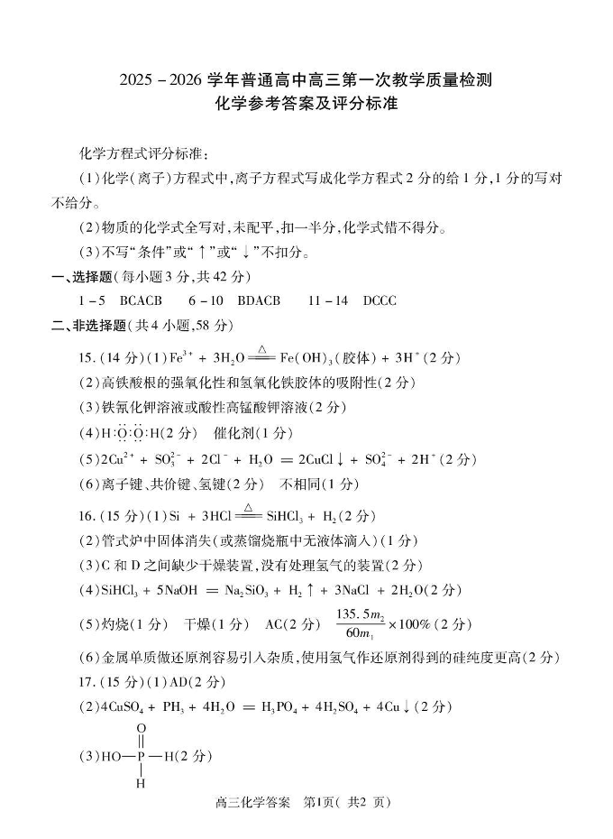 2025-2026学年普通高中高三第一次教学质量检测 化学答案.pdf