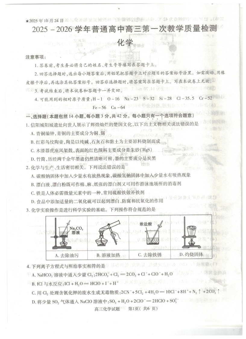 2025-2026学年普通高中高三第一次教学质量检测 化学.pdf