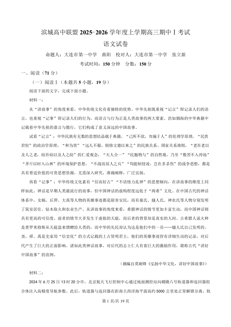 辽宁省大连市滨城高中联盟2026届高三上学期期中Ⅰ考试 语文答案.docx