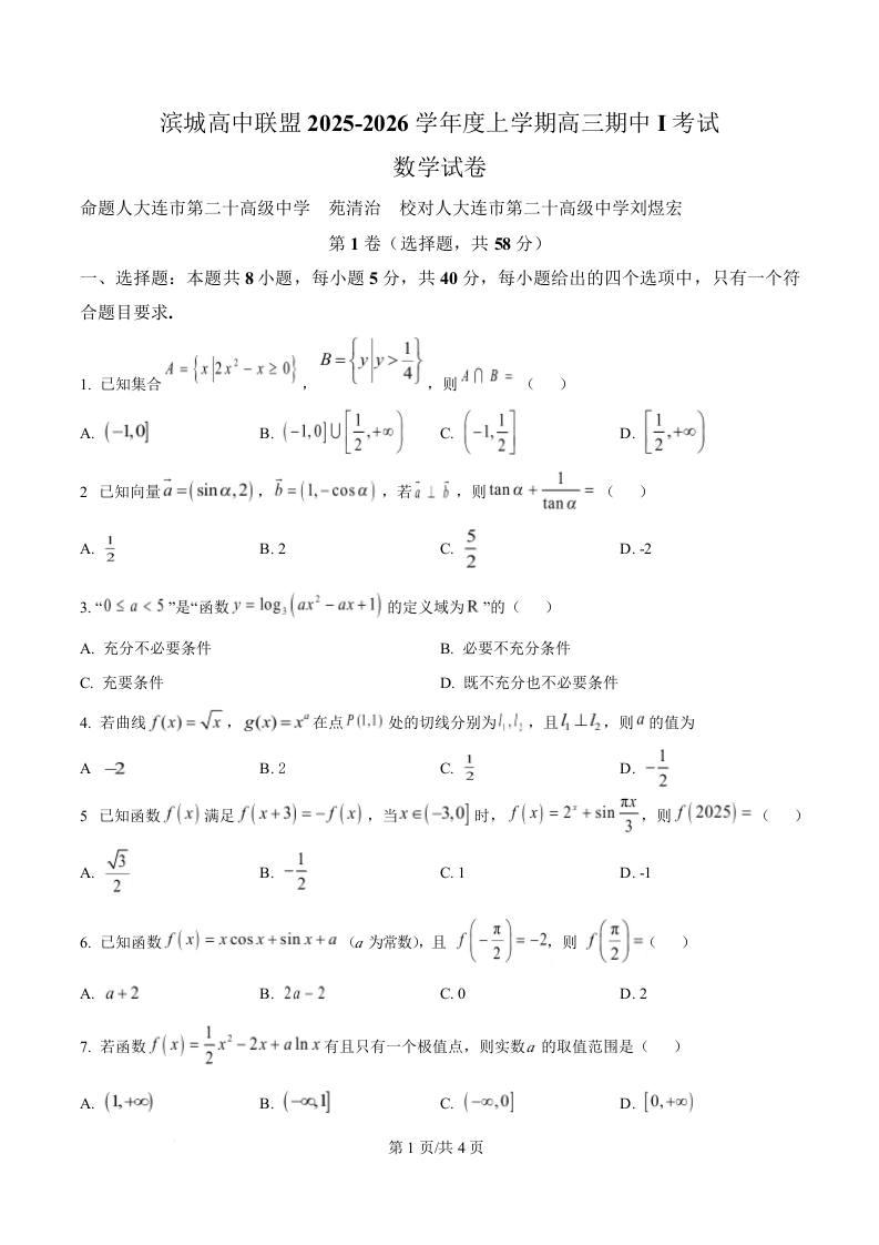 辽宁省大连市滨城高中联盟2026届高三上学期期中Ⅰ考试 数学.docx