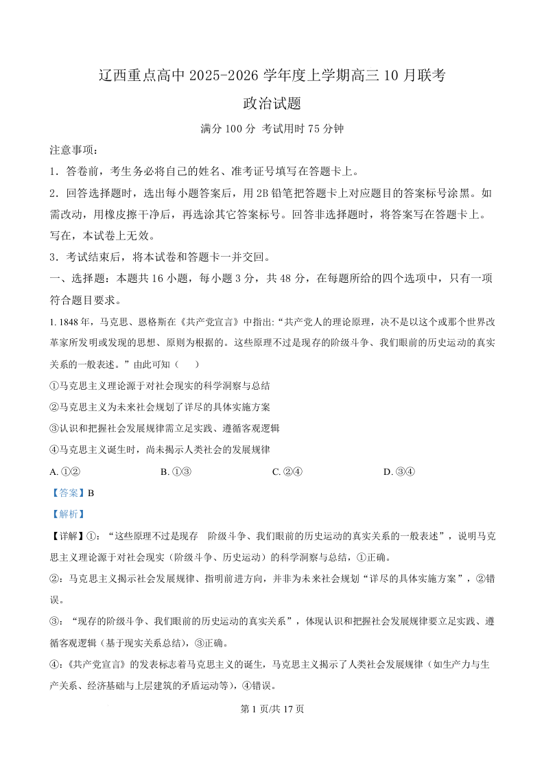 辽宁省辽西重点高中2026届高三上学期10月月考 政治答案.docx