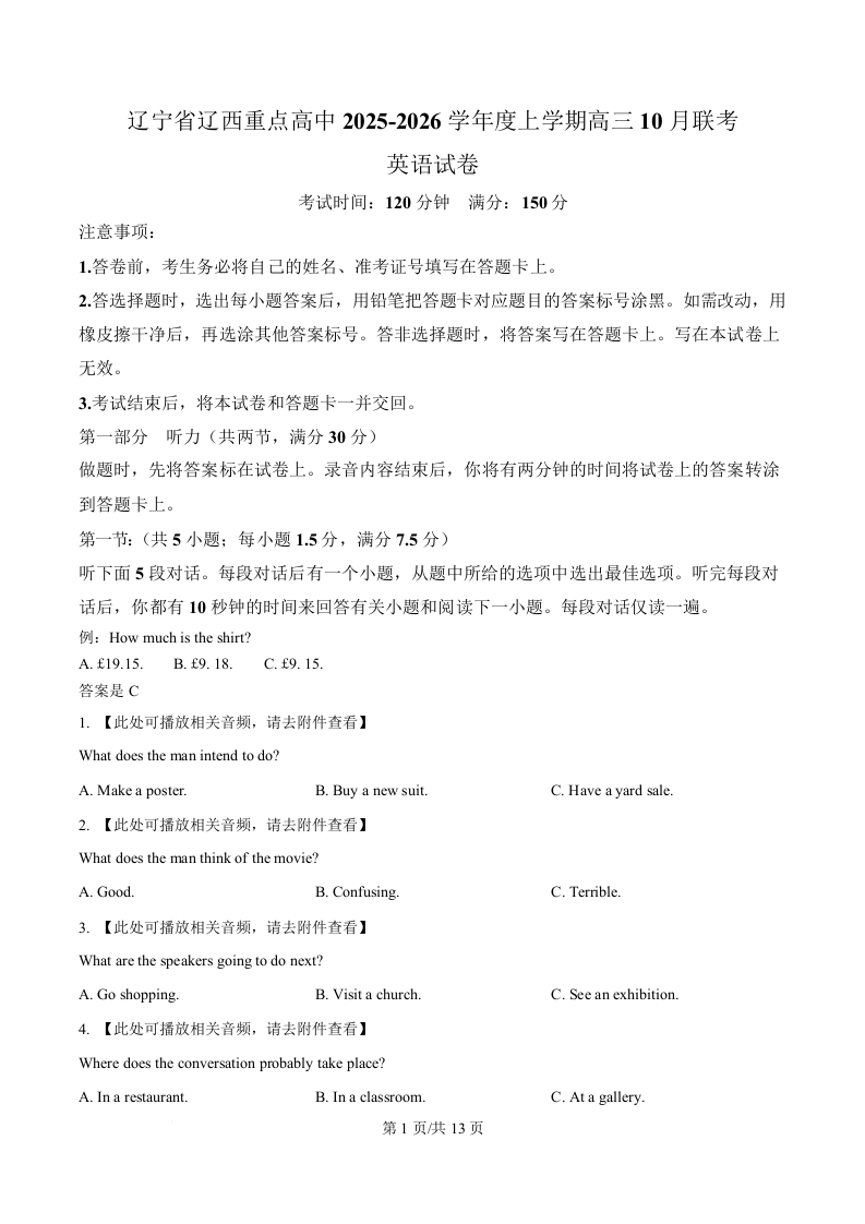 辽宁省辽西重点高中2026届高三上学期10月月考 英语.docx