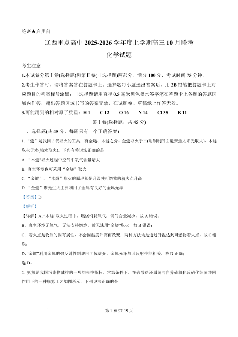 辽宁省辽西重点高中2026届高三上学期10月月考 化学答案.docx