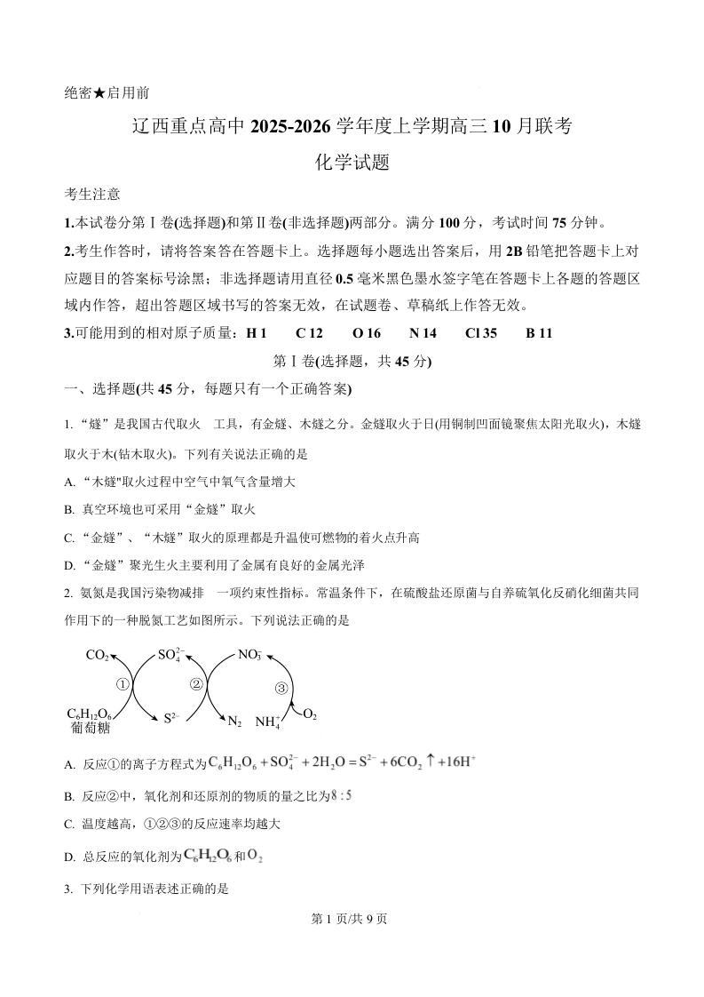 辽宁省辽西重点高中2026届高三上学期10月月考 化学.docx