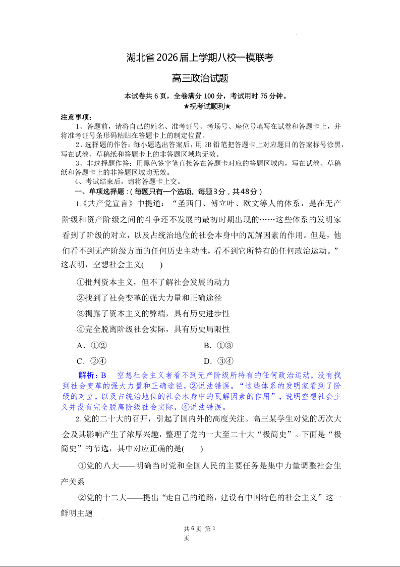 湖北省2026届上学期八校一模联考 政治解析版.docx