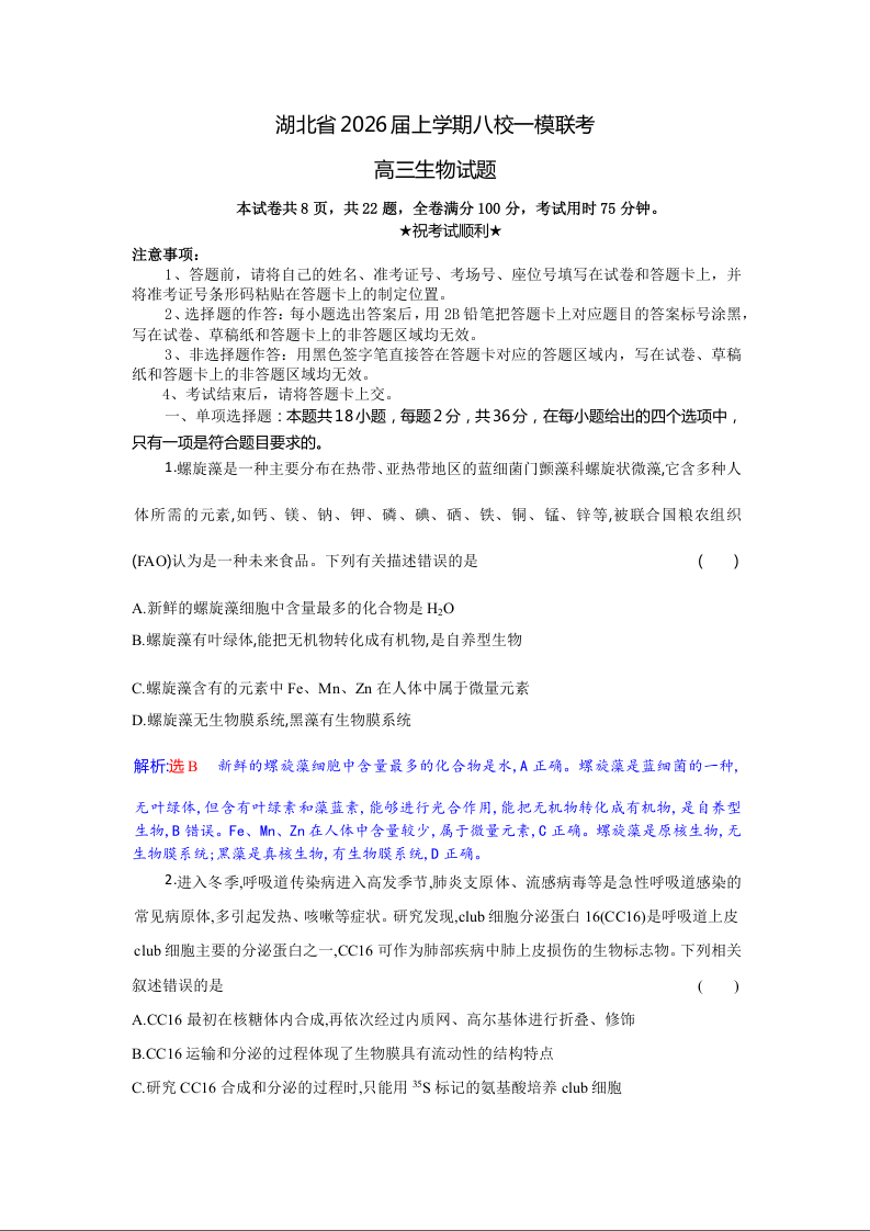 湖北省2026届上学期八校一模联考 生物解析版.docx