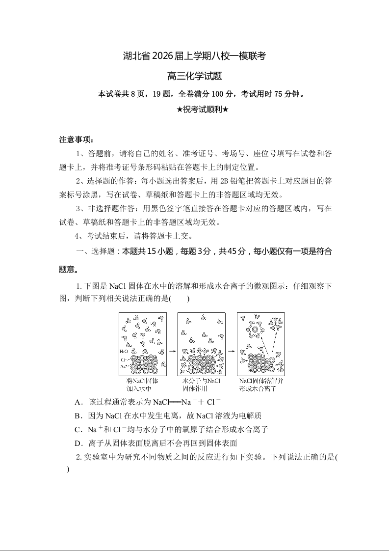 湖北省2026届上学期八校一模联考 化学.docx