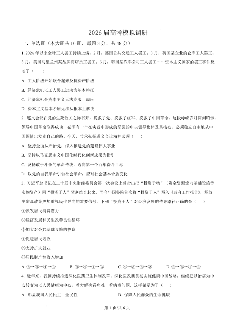 江苏省南京师范大学附属中学2026届高三上学期10月月考 政治.docx