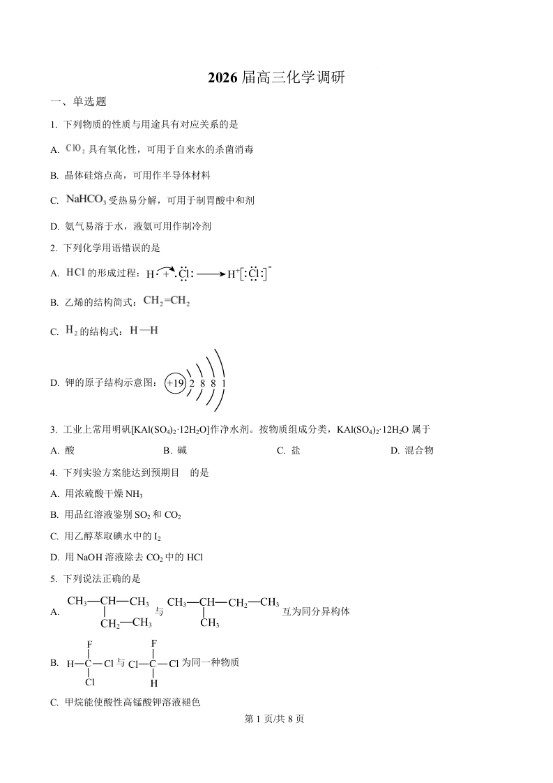 江苏省南京师范大学附属中学2026届高三上学期10月月考 化学.docx