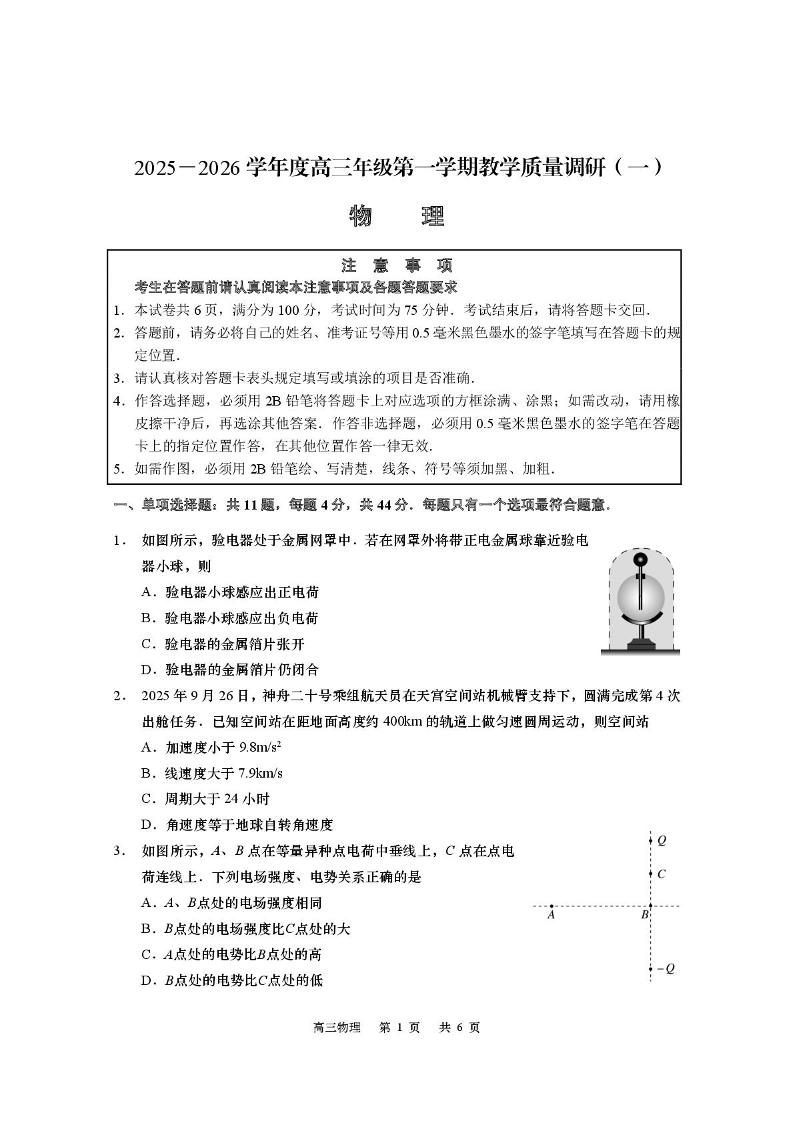 江苏省南通市如皋市2026届高三上学期教学质量调研(一)物理试题(含答案).pdf