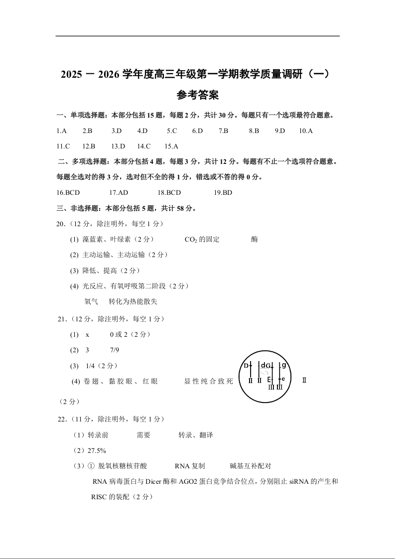 江苏省南通市如皋市2026届高三上学期教学质量调研(一)生物答案.docx