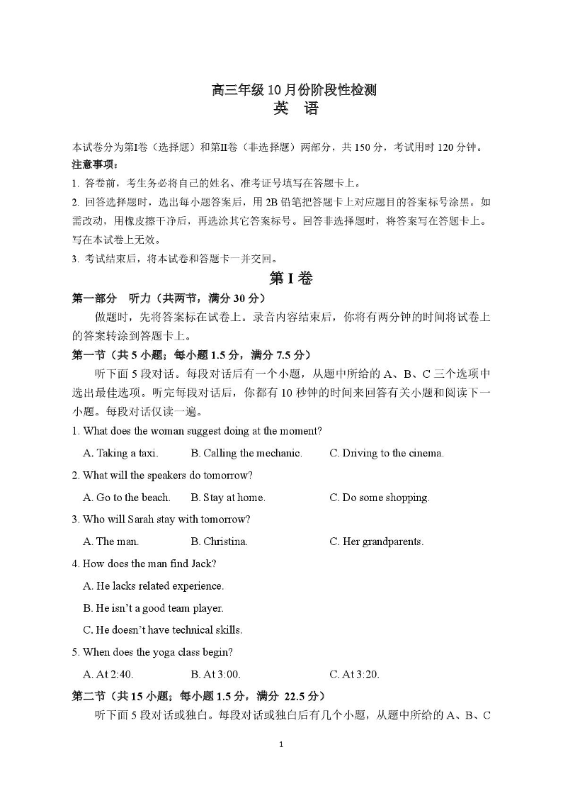 山东师范大学附属中学2026届高三上学期10月份阶段性检测 英语试题(含答案).pdf