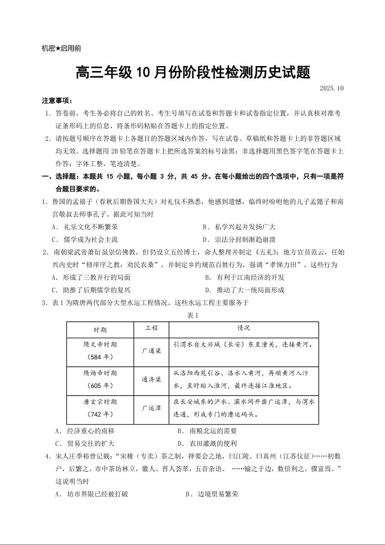 山东师范大学附属中学2026届高三上学期10月份阶段性检测 历史.docx