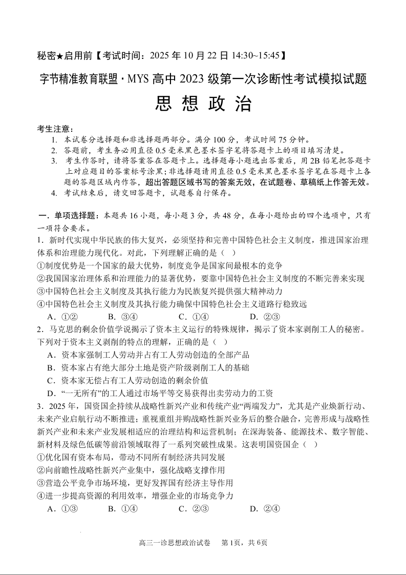 四川省字节精准教育联盟2026届高三上学期第一次诊断性考试模拟 政治试卷(含答案).docx