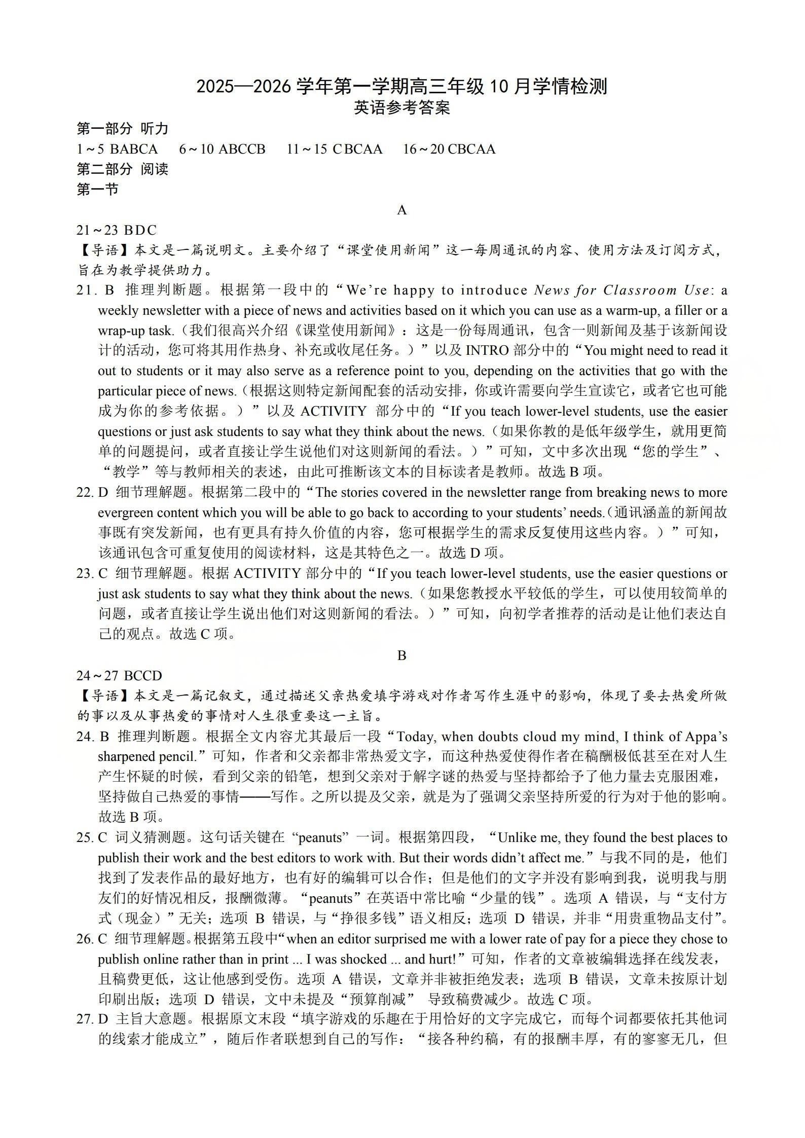 2025-2026学年第一学期高三年级10月学情检测 英语答案.pdf