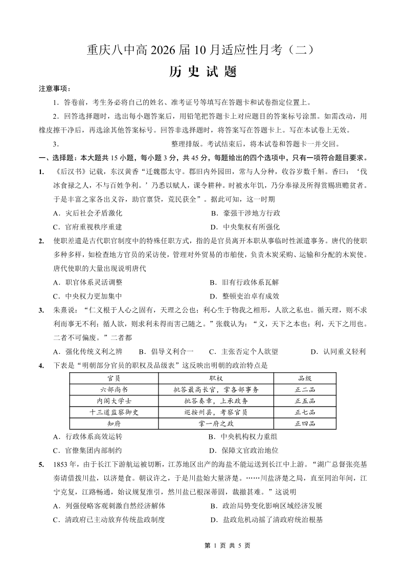 重庆市第八中学2026届高考适应性月考卷(二)历史.pdf
