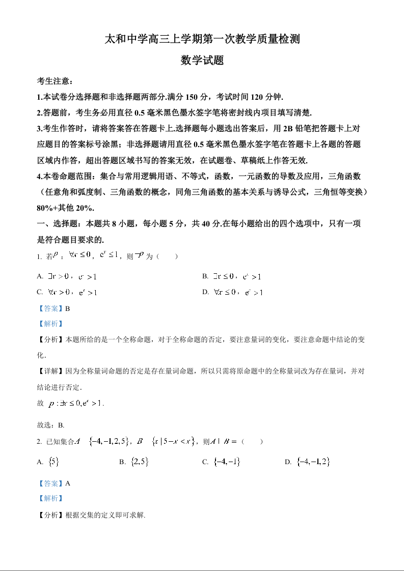 太和中学高三上学期第一次教学质量检测 数学答案.docx