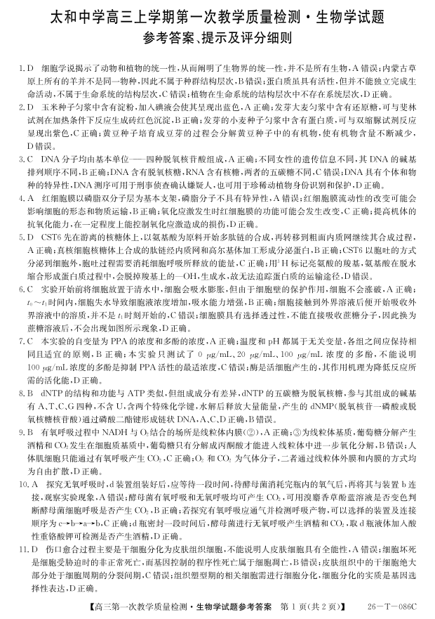 太和中学高三上学期第一次教学质量检测 生物答案.pdf