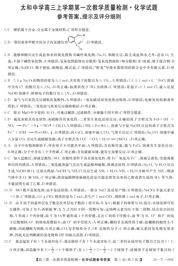 太和中学高三上学期第一次教学质量检测 化学答案.pdf