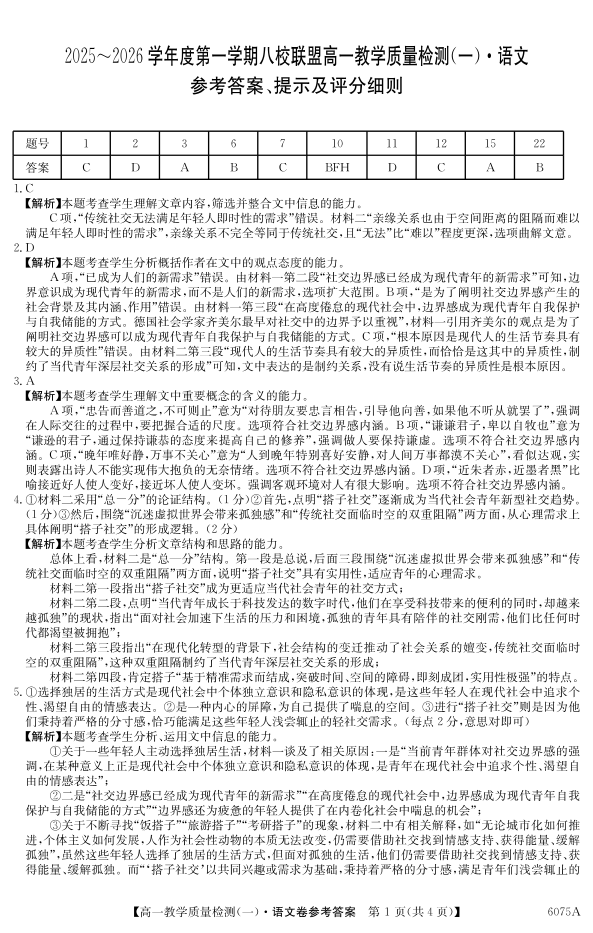 广东省2025~2026学年度第一学期八校联盟高一教学质量检测(一)语文答案.pdf