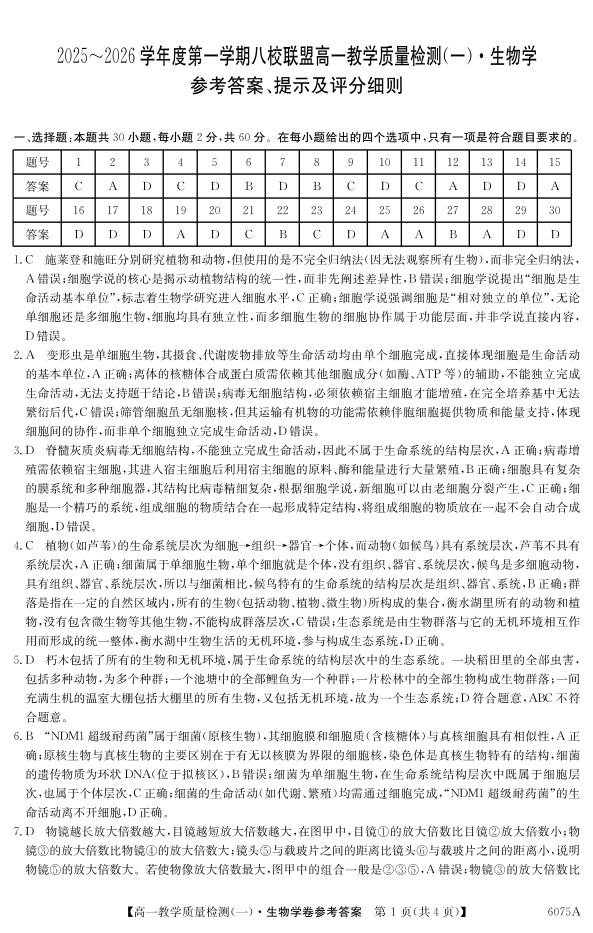 广东省2025~2026学年度第一学期八校联盟高一教学质量检测(一)生物学答案.pdf