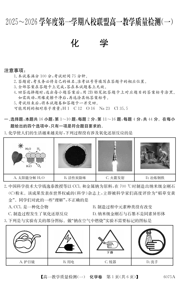 广东省2025~2026学年度第一学期八校联盟高一教学质量检测(一)化学.pdf