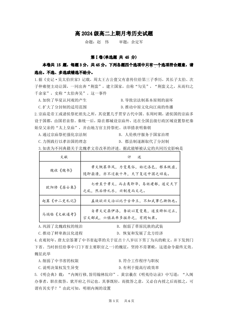 重庆市万州二中高2024级(2026届)高二上学期10月月考 历史.pdf