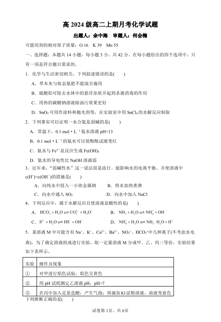 重庆市万州二中高2024级(2026届)高二上学期10月月考 化学.pdf