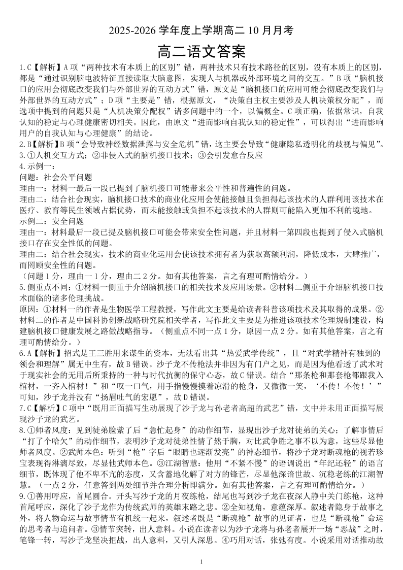楚天协作体2025-2026学年度上学期高二10月月考 语文答案.pdf
